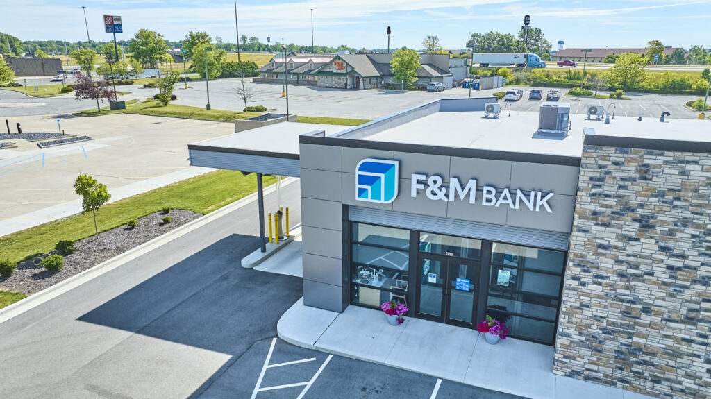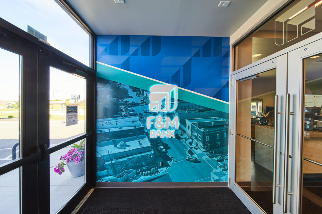 By collaborating and understanding F&M Bank’s core values, brand standards, and communities, NewGround was able to craft new spaces that will meet customer and employee demands seamlessly. Whether it’s the vestibule customers walk through or the branded graphics and wall coverings, every inch of the space is custom built and designed with F&M Bank in mind. Whether it’s a drive-thru, vestibule, or interior lobby, F&M Bank’s branding is consistent, beautiful, and sure to impress customers.