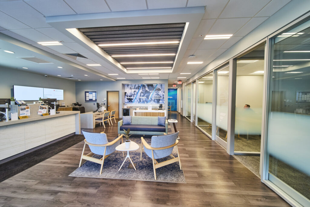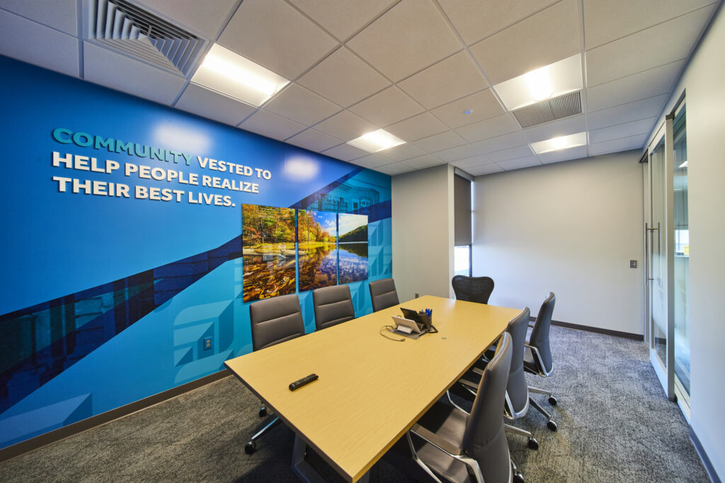 For F&M Bank, NewGround partnered to renovate and build out the interior of four separate locations, one of which was a historical renovation building. Each of these buildings had different styles, sizes, and spaces to work with, meaning that NewGround needed to remain flexible and adaptable throughout the process. To accomplish this, F&M Bank needed brand guidelines for a space that could easily be customized and scaled depending on where they were. By utilizing NewGround’s innovative Discovery Session, the client was able to come up with a brand guideline package that worked regardless of the space. This package included environmental graphics, furniture, graphic walls, branding, furnishes, and finishes. Each space was equipped with a conference room that featured local photography, branding elements, and a community message specific to the location, ensuring that F&M Bank’s core values and care for their local community was consistent throughout. We also worked with local subcontractors in each location, keeping the work tied closely to the community. F&M Bank’s branding is present throughout each space, with rich wooden tones, beautiful blue coloring from the logo incorporated through environmental graphics, signage, and furniture, and lighting that brings the space to life and creates a welcoming atmosphere.
