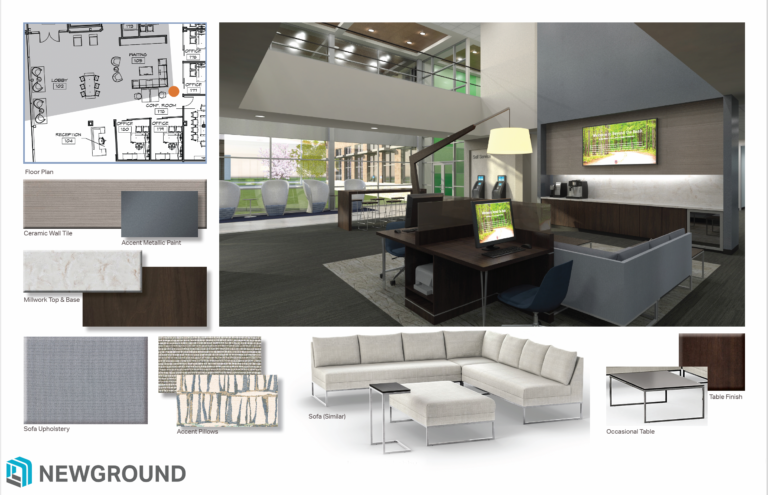 NewGround’s team of interior designers and furniture specialists know full well the effect furniture can have on a space. Each individual piece is placed with a purpose and with the brand in mind. Furthermore, NewGround partners with MillerKnoll, allowing us to have a wide and expansive furniture inventory. Our furniture experts help narrow down a selection for our clients to choose from based on their branding, goals, and space design they want to portray. After that, our clients can choose which pieces of furniture they think best represents them with the careful guidance of our Design Team.