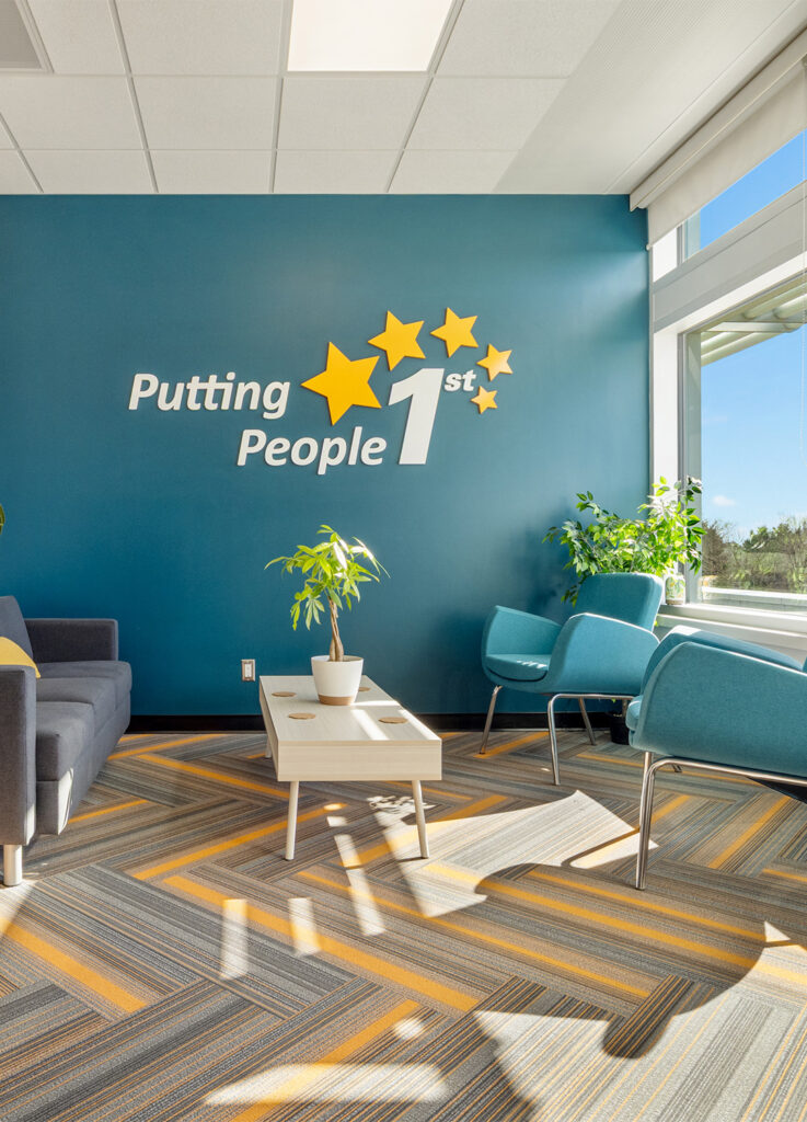 Environmental graphics were woven throughout the design, helping bring the credit union’s brand to life. They included an employee-centric environmental graphic wall celebrating five outstanding team members honored each year, a small but powerful way to make appreciation part of the daily culture.