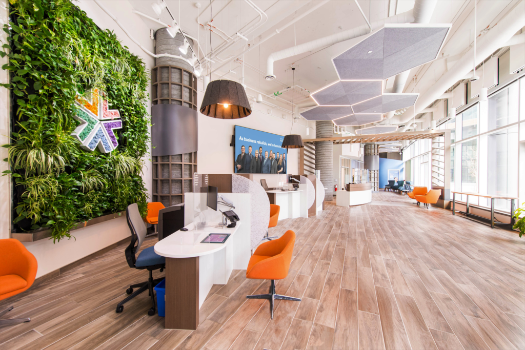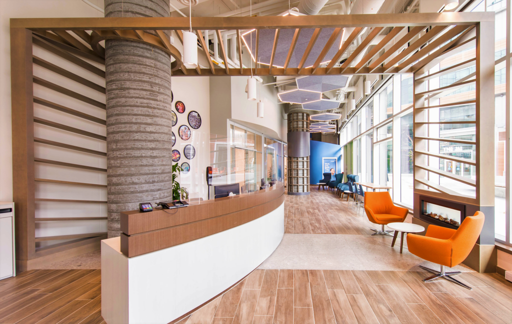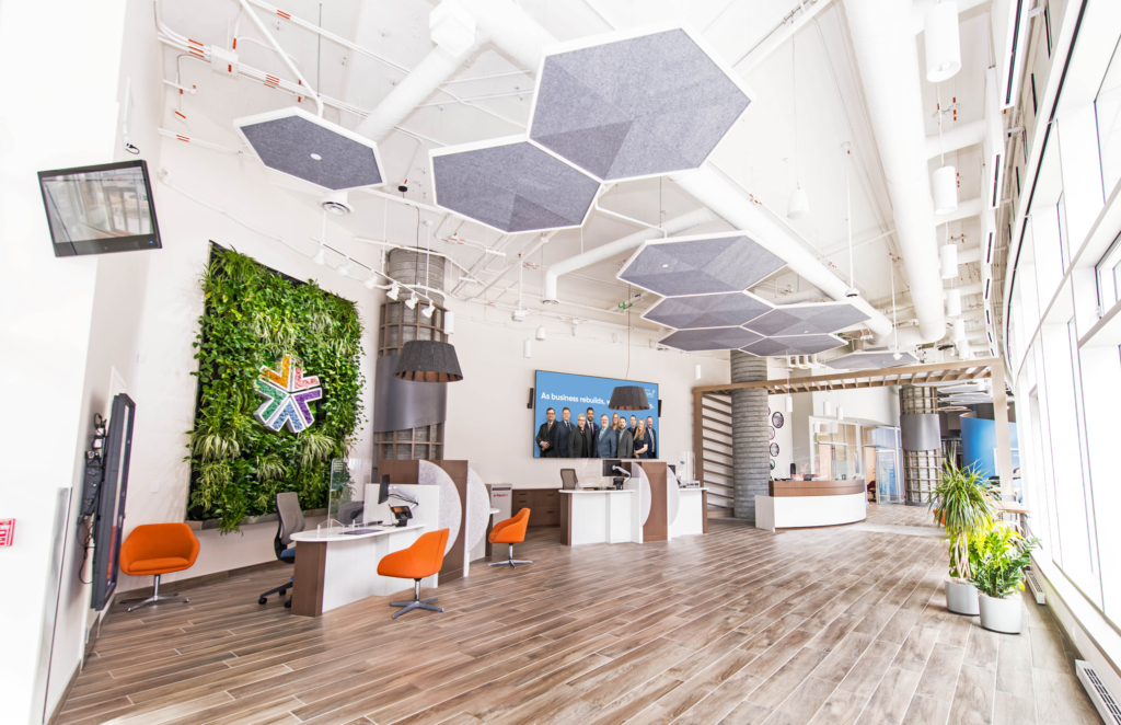 The facility is now an architectural masterpiece with an open concept floor plan, neutral finishes with pops of their signature orange color, consulting and hoteling areas, and a greenery living wall showcasing Assiniboine’s logo and brand.