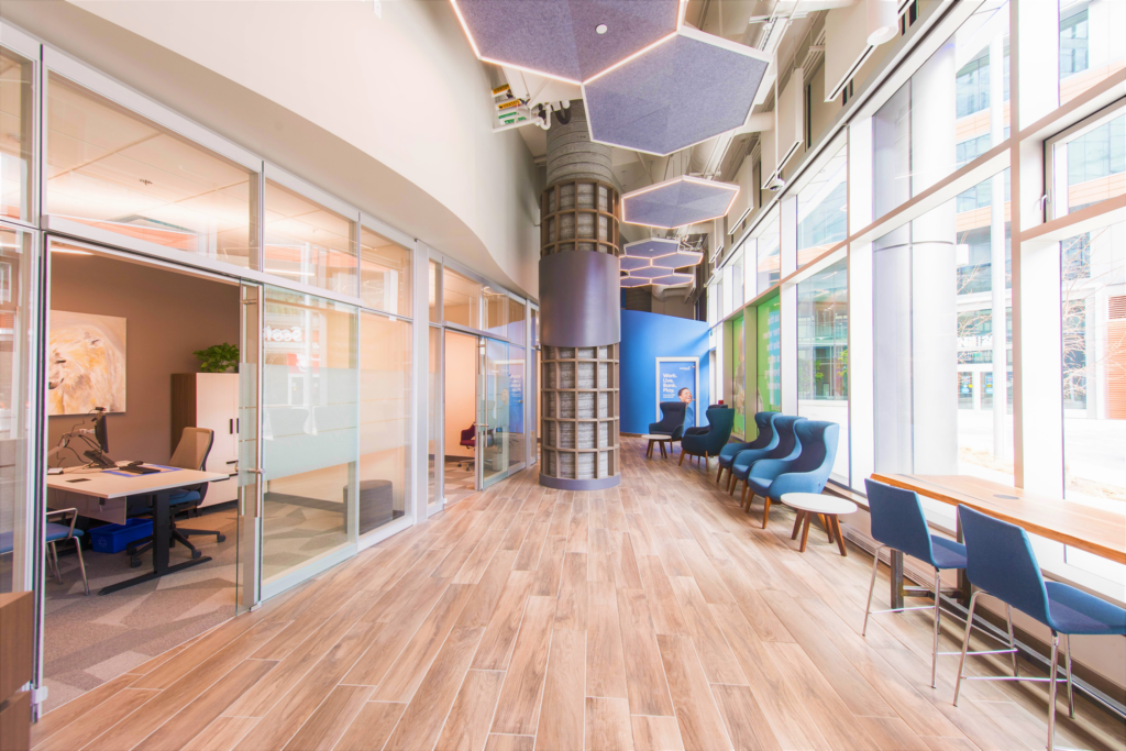 In October 2019, Assiniboine Credit Union (ACU) obtained one of the most exciting spaces in the city of Winnipeg, True North Square, which overlooks a high traffic area that frequently hosts public gatherings and sporting events on a jumbo screen. Assiniboine wanted a fresh concept from a new design partner with expertise in credit union design trends and a different perspective for the branch in this mixed-use development.