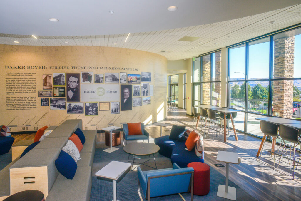 From the moment guests enter the building, they can see the brand and history infused throughout the space. The lower level community room and breakout space allow Baker Boyer Bank to host larger bank and community events, even after hours. The fun and flexible breakout space showcases a detailed history wall graphic that walks any reader through Baker Boyer Bank’s story, from the years of the Gold Rush to the completion of this very building. With a variety of furniture options, the community room can be reconfigured for different types of events, from training to lectures.