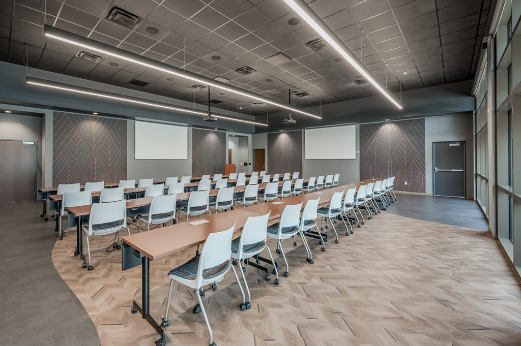 Lastly, the client wanted a community/training room that could be used by external groups after hours. This space was built to handle a large number of seating possibilities depending on the group size and meeting type and was crafted to operate completely independently of the main branch for after-hours use. A large parking area was also built to accommodate visiting members and community meetings.
