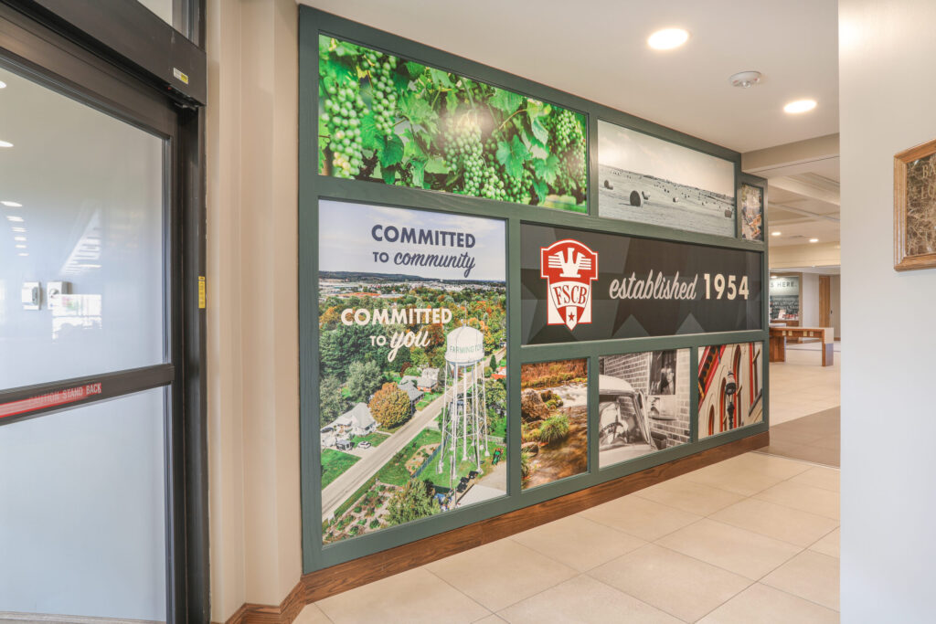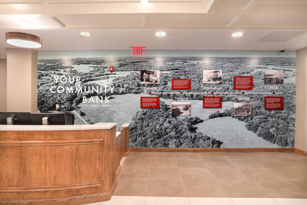 FSCB needed to create a new look and feel for their space without alienating their pre-existing customer base. NewGround needed to elevate who they were throughout their branches instead of starting from scratch with a brand-new idea. When designing the flagship branch, NewGround environmental designers decided to create a heritage and culture wall. The culture wall showcases the rich history of FSCB while still providing a fresh, new, and interesting centerpiece for customers. They incorporated wooden textures and colors, as well as a deep rich green that pairs well with the otherwise bright interior. They also kept some of the traditional details like molded ceilings but provided a fresh perspective with new paint colors and an open layout.