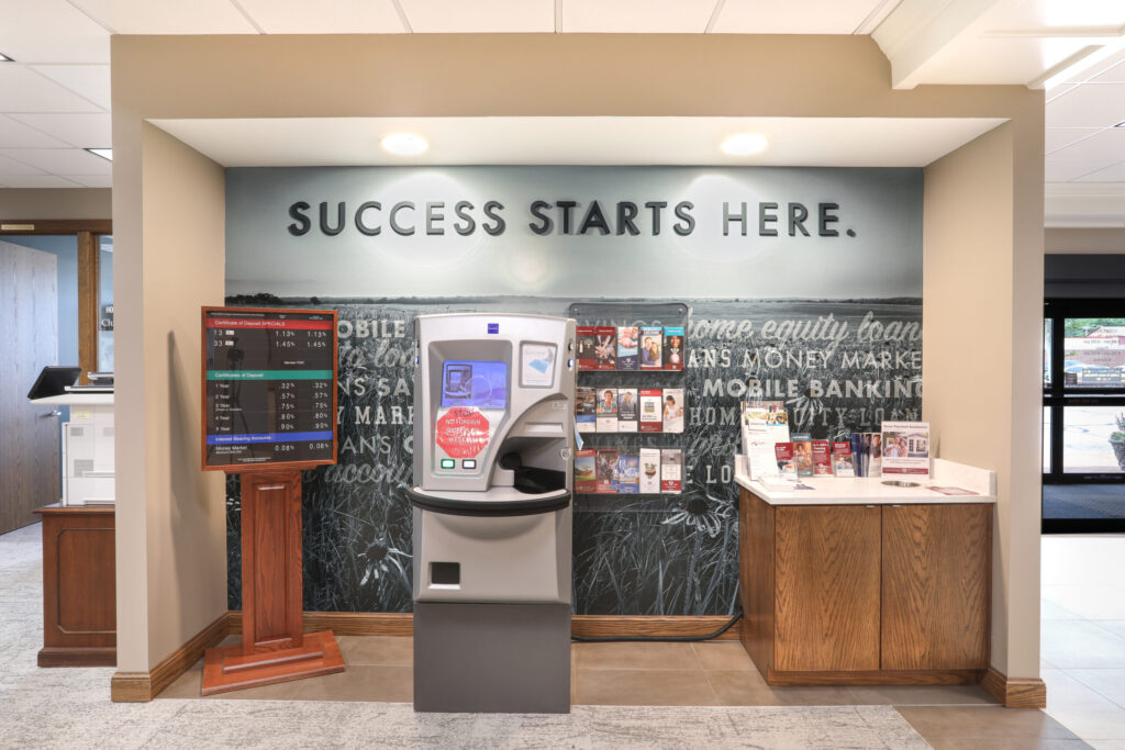One of the key design features that FSCB aimed to implement was reducing the size of their lobby. The previous lobby of this location was cavernous, huge, and intimidating. They wanted to move their tellers further up, closer to the customers, and create office space behind the teller area. They needed a functional update to the branch as well since it was 20 years old and in heavy need of technological upgrades. NewGround designers and architects made sure to keep all of these concepts at the front of their designs. We added an ATM wall, cash counter, and cash recycler to their design, and surrounded them with warm, inviting colors and rich wooden textures.