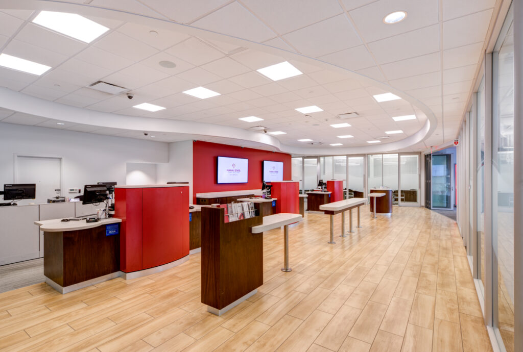 The design/build of the new branches focused on creating a more open feel without sacrificing privacy. This included incorporating a low profile “cash bar” with universal bankers, a new floor layout, and plenty of natural light in each office using modular walls and lighting controls. These also made the space more energy efficient.
