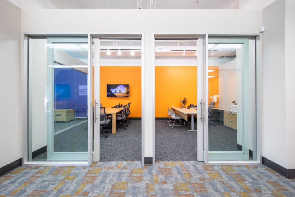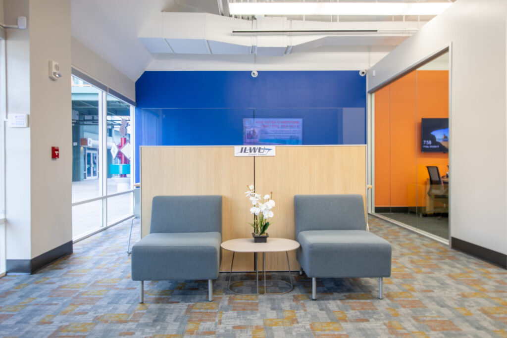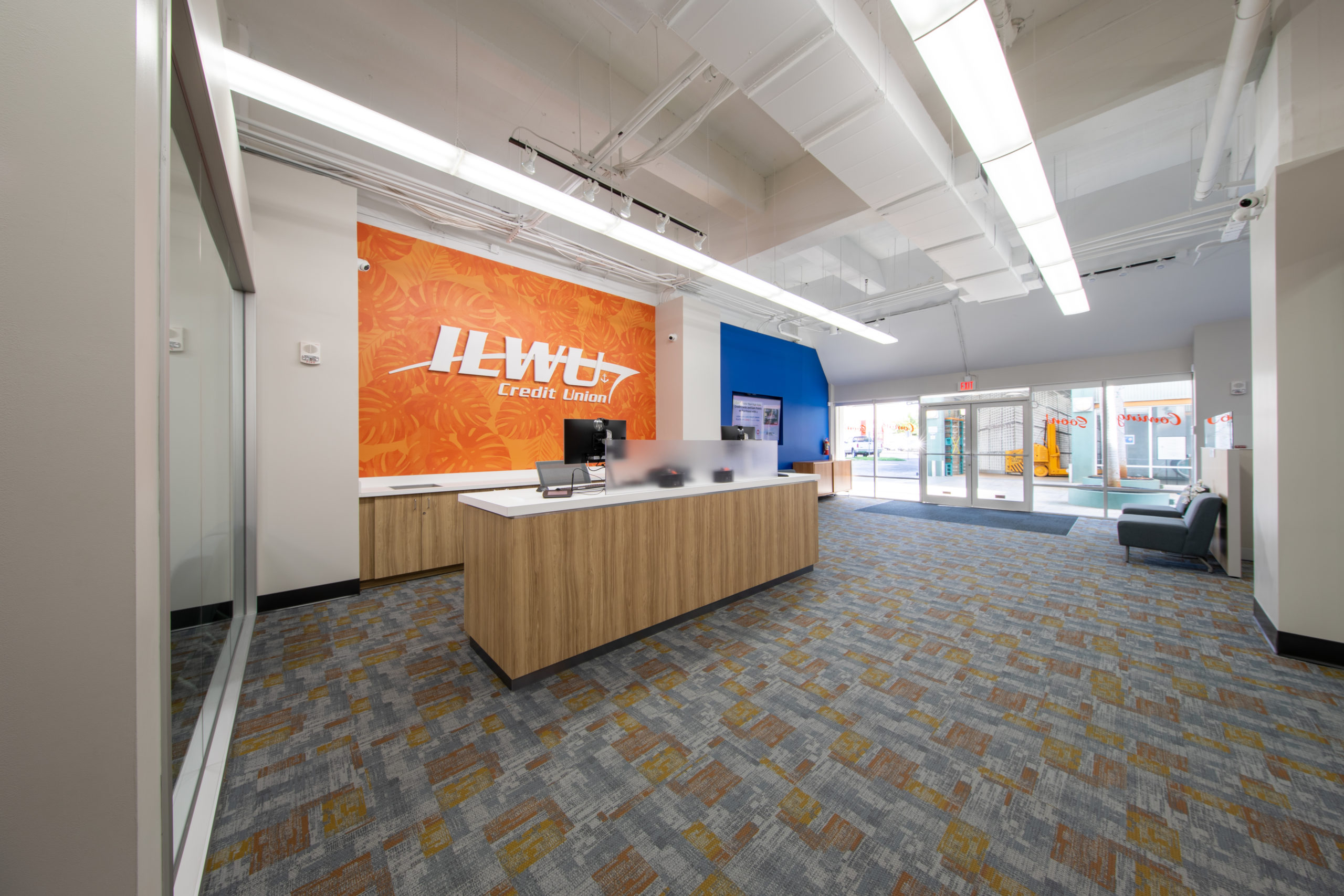Providing all architectural, engineering, interior design, and construction services, NewGround transformed the 1,776 square foot branded retail environment to enhance the member experience. ILWU’s logo and signature bright orange and blue brand colors are integrated throughout the space, complete with video conferencing technology, private offices, and an overall bigger branch to better serve members.