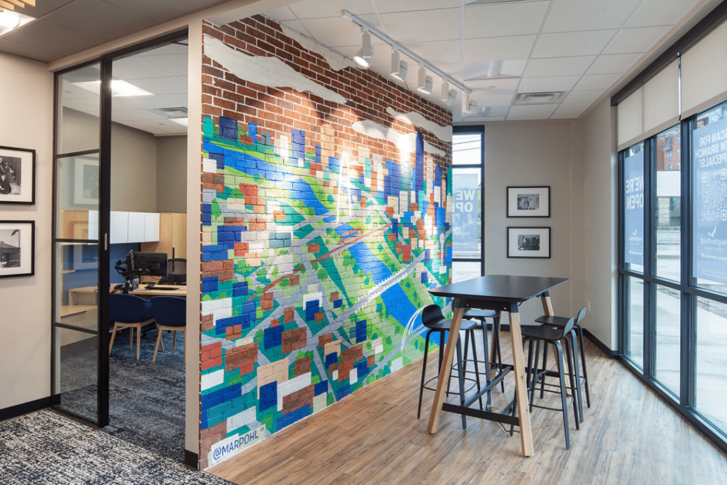 While ITMs are typically done without the need for employee support, concierge desks were still included in case members needed assistance with this new technological transition. They could also direct members to individual office space if a member was there for a meeting. Aside from the architecture and design, NewGround also provided graphics for this project. The graphic designers worked hard to create a stenciled design to lay over the brick walls. NewGround also completed all furniture for the project, including cabinetry, furniture for a waiting office and video conferencing room, workstations, restrooms, break rooms, and more.