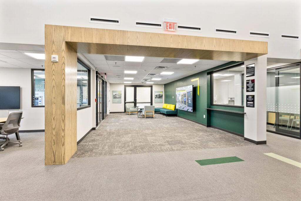 NewGround took their new branding and helped it come alive within a 3-D space. With optimized renderings, NextMark was able to see exactly what their space would look like before the process began. Furniture complimented the branding, architecture accents like wood wrapping brought life into the space, and masking brought the large area together into a closer-knit welcoming lobby.