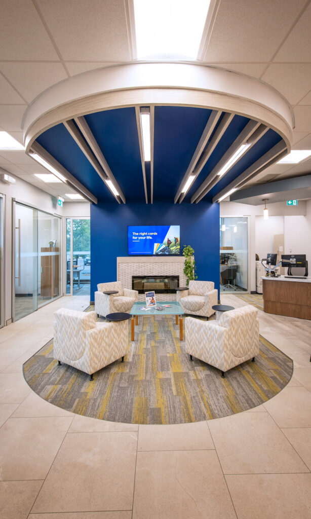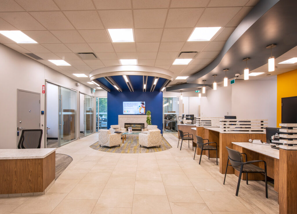 Rather than starting from scratch, we looked for ways to refresh and reuse wherever possible. Existing furniture was reupholstered, and finishes were updated. The lighting plan was completely reworked to create softer, ambient illumination, this was important for staff members who struggle with light sensitivity and headaches. Each teller station was designed to be height-adjustable, giving employees flexibility and comfort when working with members.