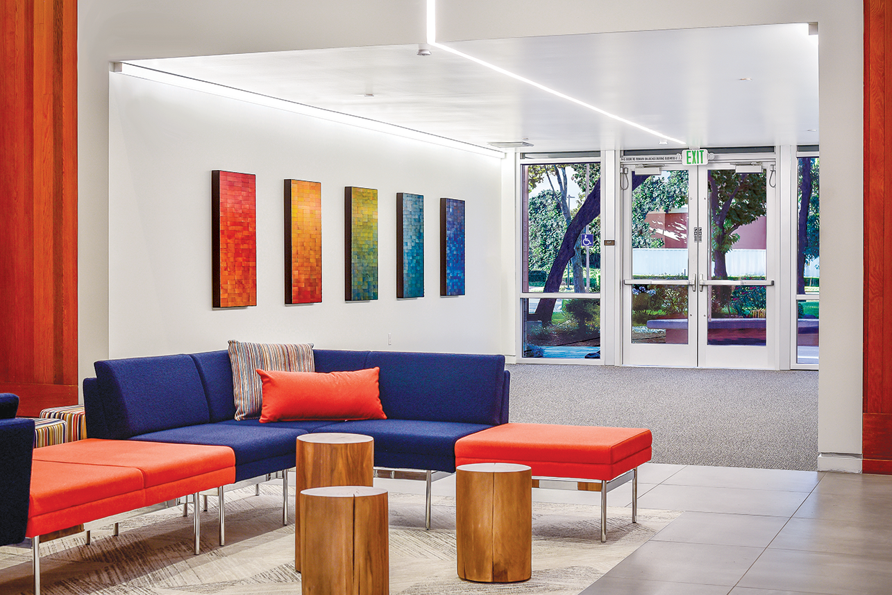 We also incorporated many bright colors throughout the rooms, such as the bright blue cabinets featured in the employee breakroom. We also changed the windows to let in more light and help the spaces feel open and inviting.