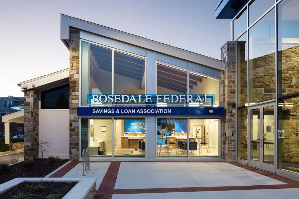 The newly renovated 4,220 square foot flagship branch highlights a refreshed take on Rosedale Federal Savings & Loan Association’s brand and features: