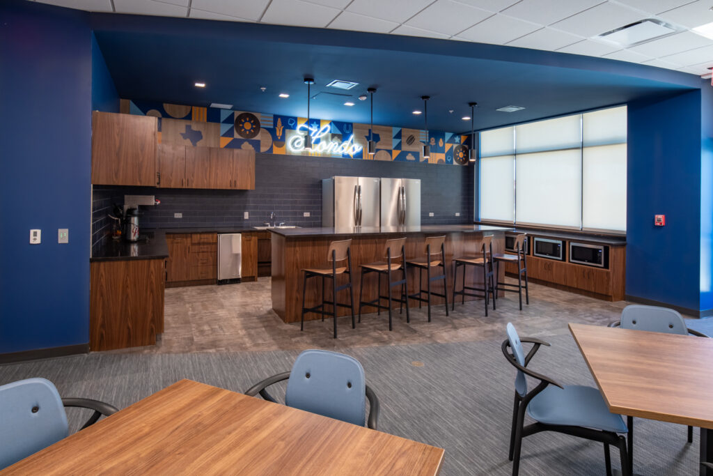 An important part of TXN Bank’s branding and culture is their Texas heritage, traditions and community. The building needed to bring together employees from two separate locations into a new, refreshed, and revitalized space. To incorporate both institutions and groups of employees, the space was filled with meaningful environmental graphics, such as a history wall. This history wall pays homage to both financial institutions that merged to create TXN bank, honoring the history of everything that went into this new main office space. The employee journey was carefully considered in the modern rustic space, giving employees new amenities, better workspaces, and comfortable and dynamic furniture through NewGround’s MillerKnoll partnership. Plenty of natural lighting, even in stairwells, helped give the space a vibrant and fresh atmosphere.