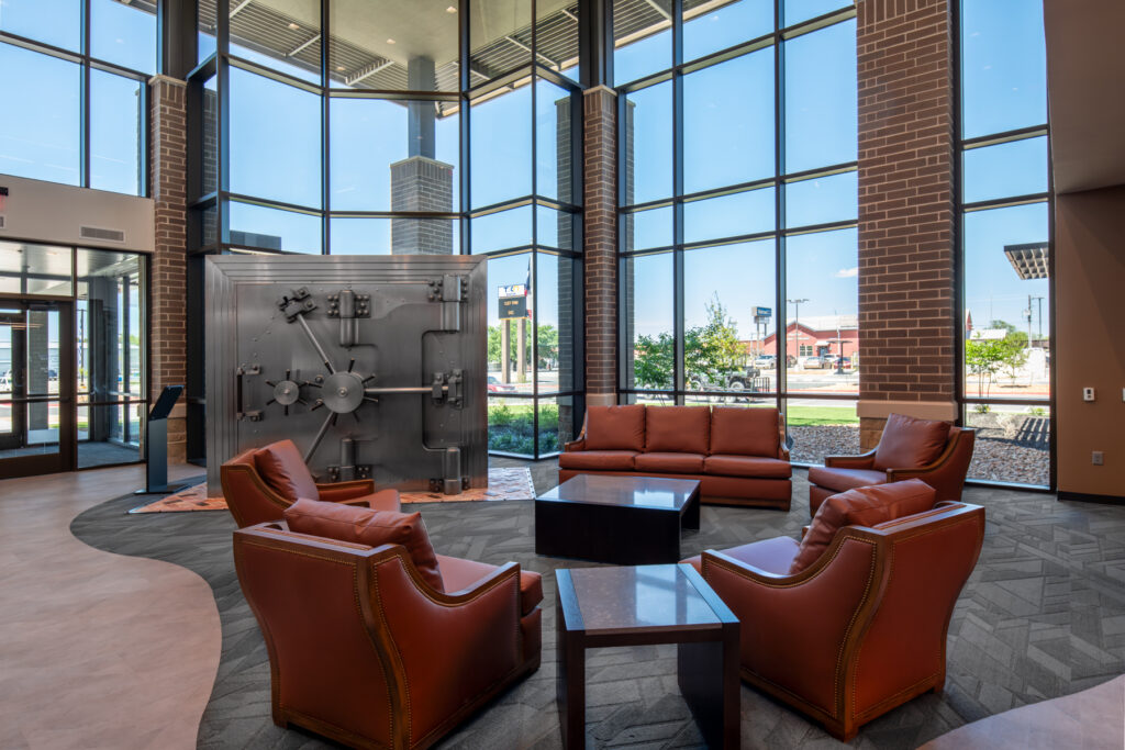The TXN Bank location also carefully considered the customer journey. Because there was a branch built into the space as well, the customer journey had to be evaluated alongside the employee journey. Main office employees shouldn’t necessarily interact with regular customers, and customers shouldn’t get lost if they are simply trying to complete regular transactions. To accomplish this, the branch incorporated a traditional teller line and service center with natural wood finishes to guide customers to where they needed to go. There is also an ADA counter and upgraded drive-up lanes with ITMs to accommodate increased traffic. However, TXN Bank also wanted their customers to be able to appreciate the rich history of the organization, so with the help of NewGround, TXN Bank created a showroom that displayed a historic vault door. This historic door symbolizes TXN Bank’s unwavering loyalty to its customers and is an impressive centerpiece of the space.